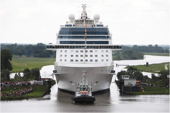 Celebrity Cruises’ newest vessel, the $750 million Celebrity Silhouette, was manoevred carefully from her birthplace in Papenburg, Germany to open sea in Emshaven, Netherlands on 1 July.