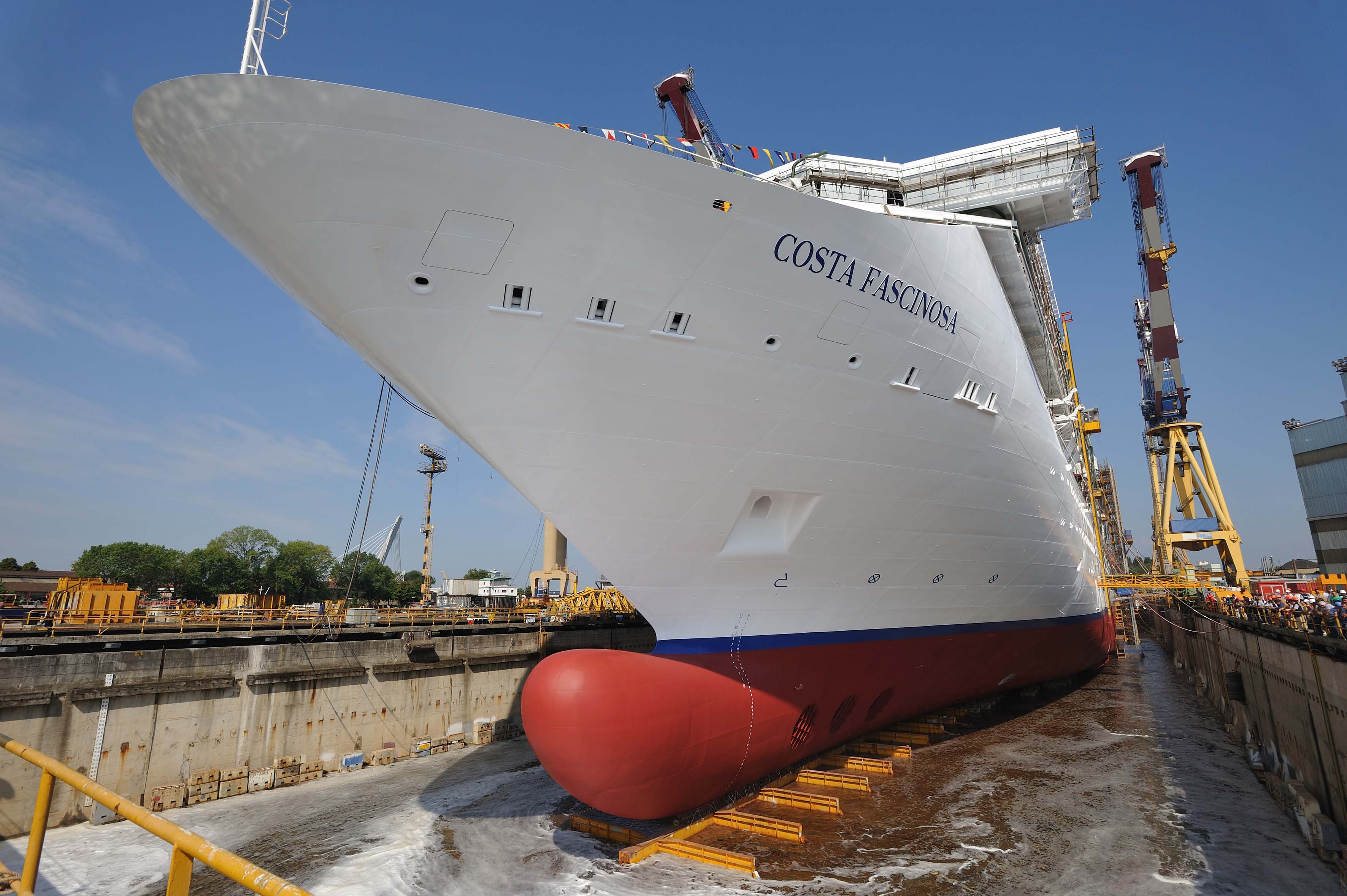 A month after her sister Favalosa launched to much fanfare in Italy, Costa Fascinosa touched water for the first time at her technical launch at the Fincantieri shipyard in Marghera, Venice.
