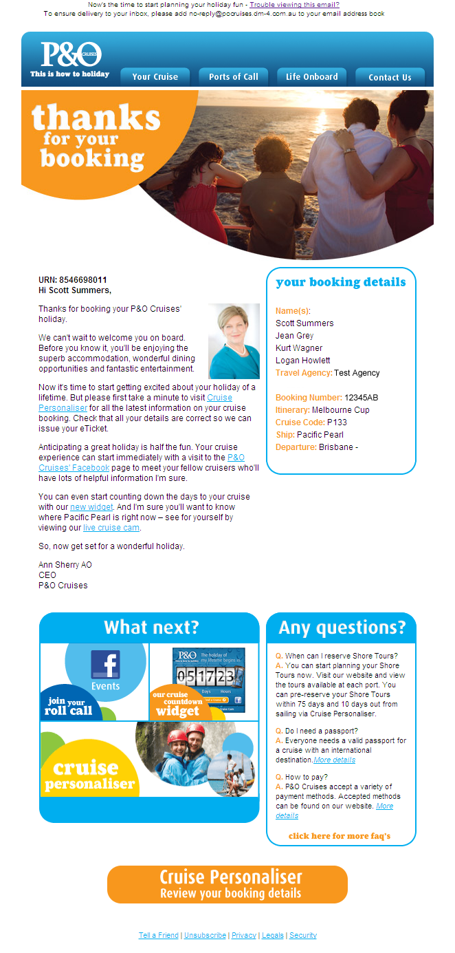 Passengers set to embark on a P&O cruise will now receive a tailored series of personalised emails from a host of cruise luminaries including Carnival Australia CEO Ann Sherry, the ship’s captain, the cruise director and shore tour manager.