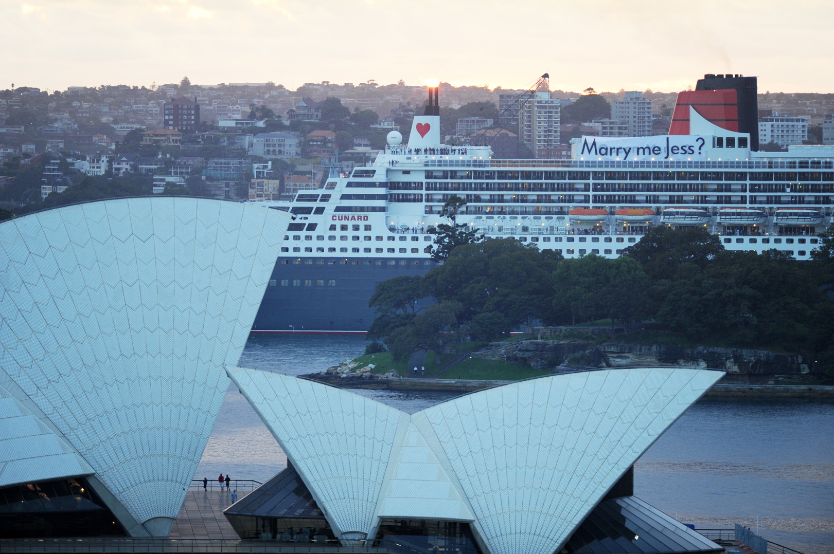 Hearts were aflutter across Sydney early this morning when Cunard’s Queen Mary 2 sailed through the heads sporting a 25-metre long banner with a surprise proposal.
