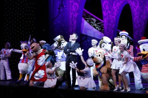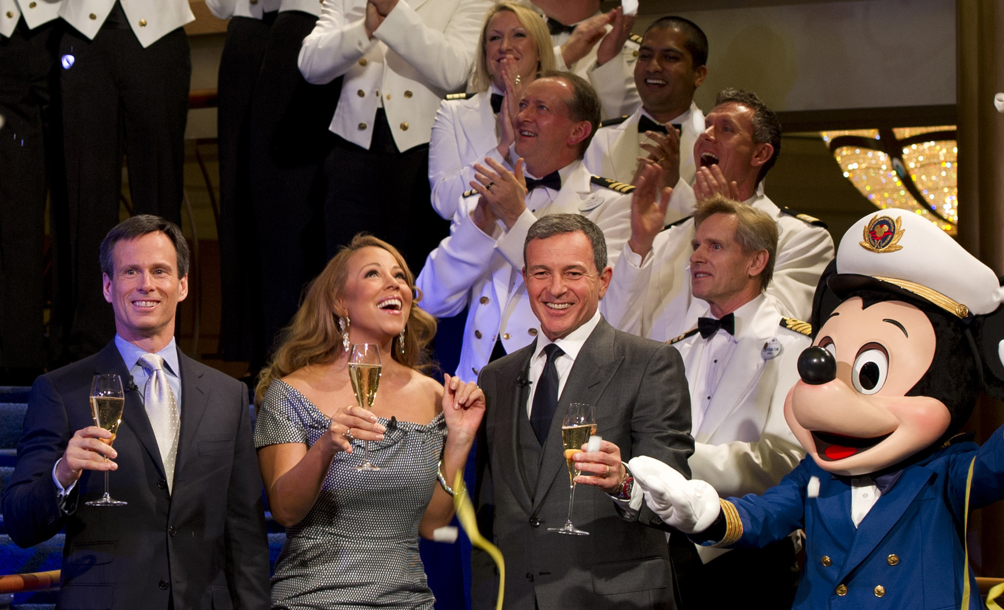 A 6-foot tall bottle of champagne erupted to shower guests in the atrium with confetti and streamers with Captain Mickey Mouse, Walt Disney Company president and CEO Bob Iger and Walt Disney Parks and Resorts chairman Tom Staggs joining in the festivities.