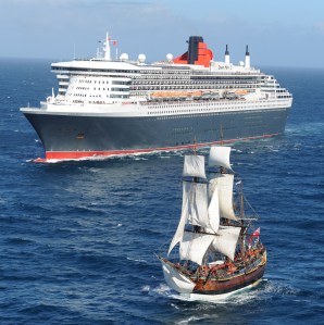 With both vessels sailing on an inaugural circumnavigation of Australia, Cunard’s Queen Mary 2 took 20 days to complete her voyage, where the Endeavour replica is expected to take 13 months.