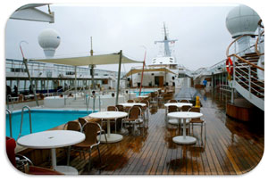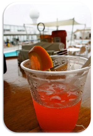 Having expected much warmer weather this time of the year, I’m disappointed to find the storm getting progressively worse, but that didn’t stop some die hard cruisers relaxing in the hot tubs and pool as my guest and I enjoyed our first cocktail pre-Sailaway.