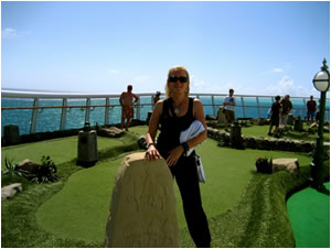 With wi-fi only available in some areas of the ship, I headed to the Sports Deck on Level 14. Miniature Golf and an Inline Skating area feature here along with the trademark Royal Caribbean Rock Climbing Wall and with the weather so picture perfect, passengers were lining up to take part in the activities available.