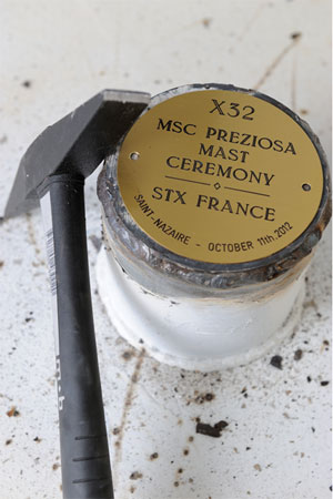 STX Shipyard in Saint-Nazaire, France welcomed MSC executives in the time-honoured tradition of welding two commemorative coins to MSC Preziosa’smast radar yesterday.