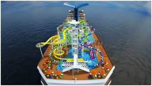 Carnival’s newest slides, the ‘Speedway Splash’, will give passengers the opportunity to race down dual side-by-side 71.6 metre (235 feet) slides with racers’ times displayed on a scoreboard and special effects adding to the experience.