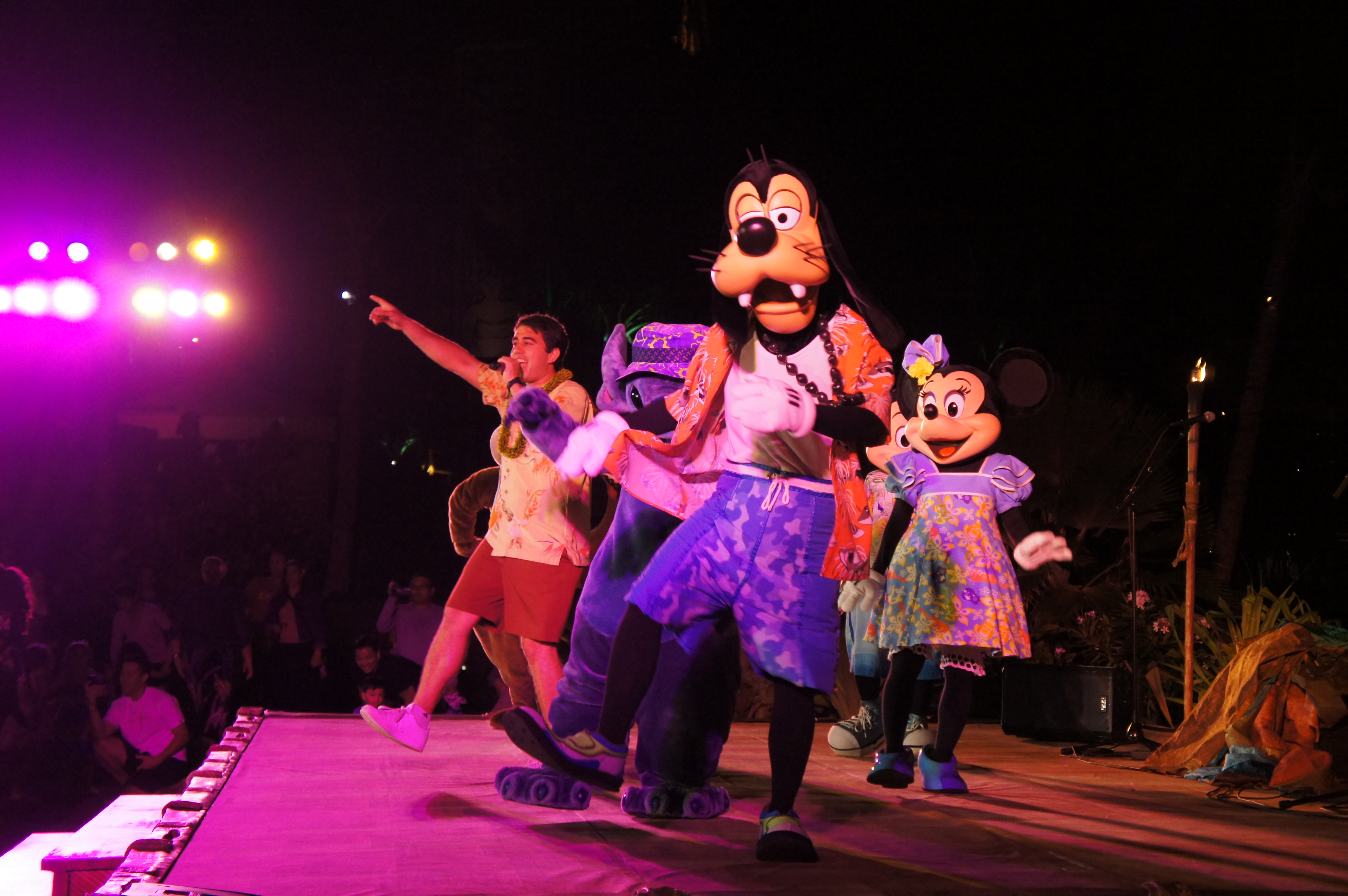 Disney characters including Mickey, Goofy and Stitch don Hawaiian shirts and teach us all some modern line dances including the “Cha Cha Slide” and “Cupid Shuffle”, before joining us on the straw