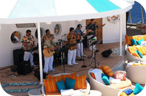 Having noticed that one of the major differences aboard Crystal was how quiet the ship is, we joined others in cheering when a Caribbean-style band made their way to the stage.
