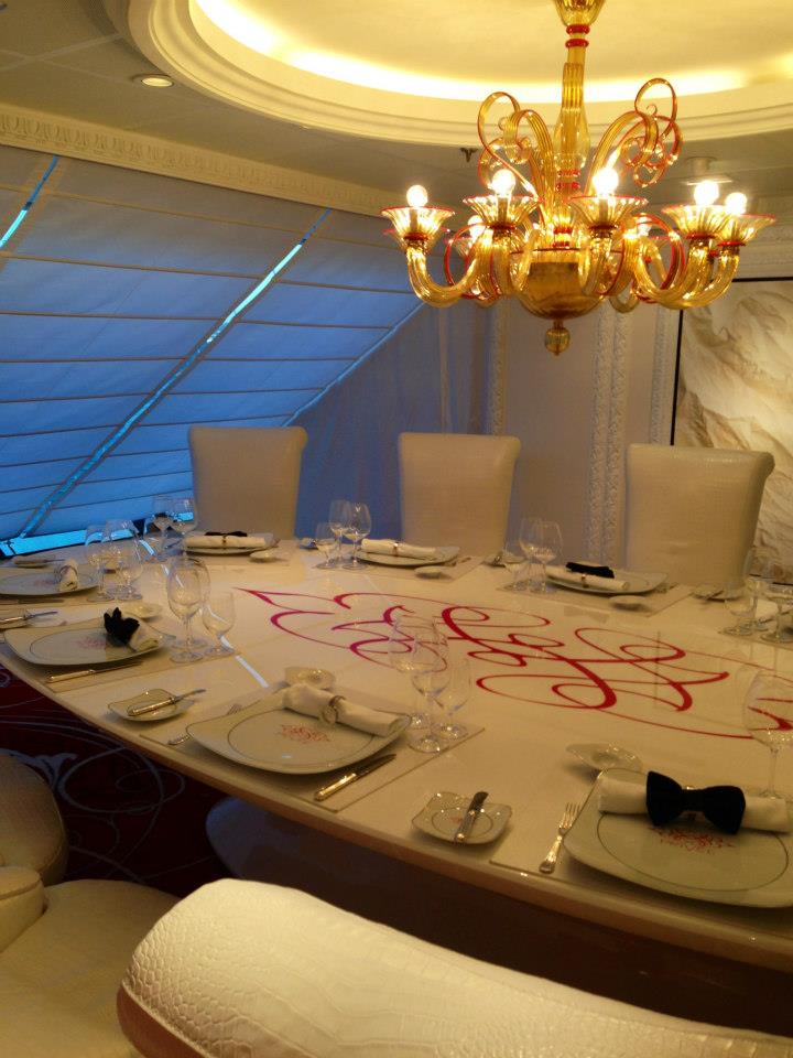 Ferrari Red carpeting graces the floor while white baby crocodile throne chairs flank a pure white table that was custom-made and airlifted into the ships during construction. And the food? Well, you are given the choice of any number of courses from Polo Grill or Toscana all for only USD$250 for up to ten lucky guests.