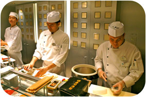 personality plus as the sushi chefs whip up dishes to order in their own flamboyant way.